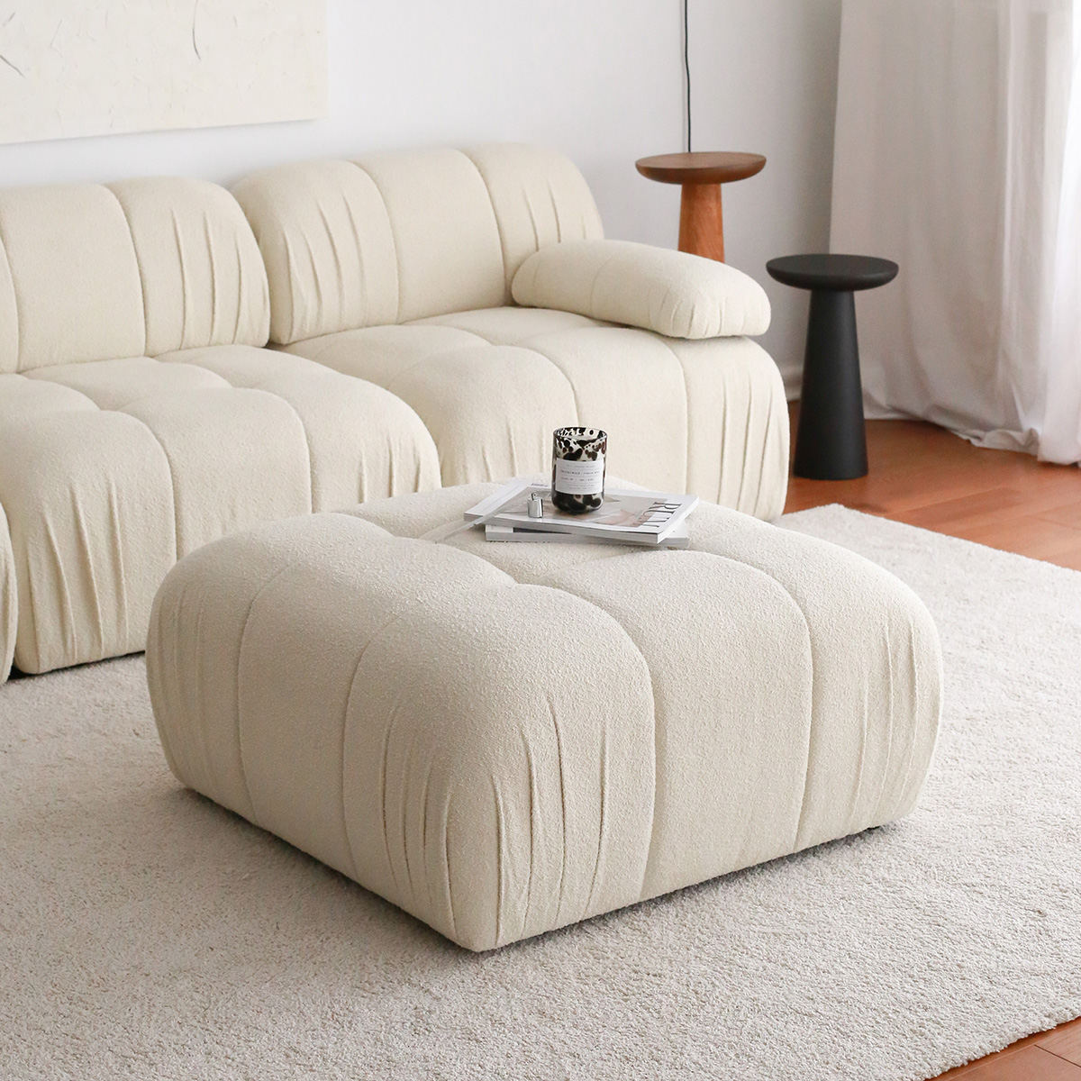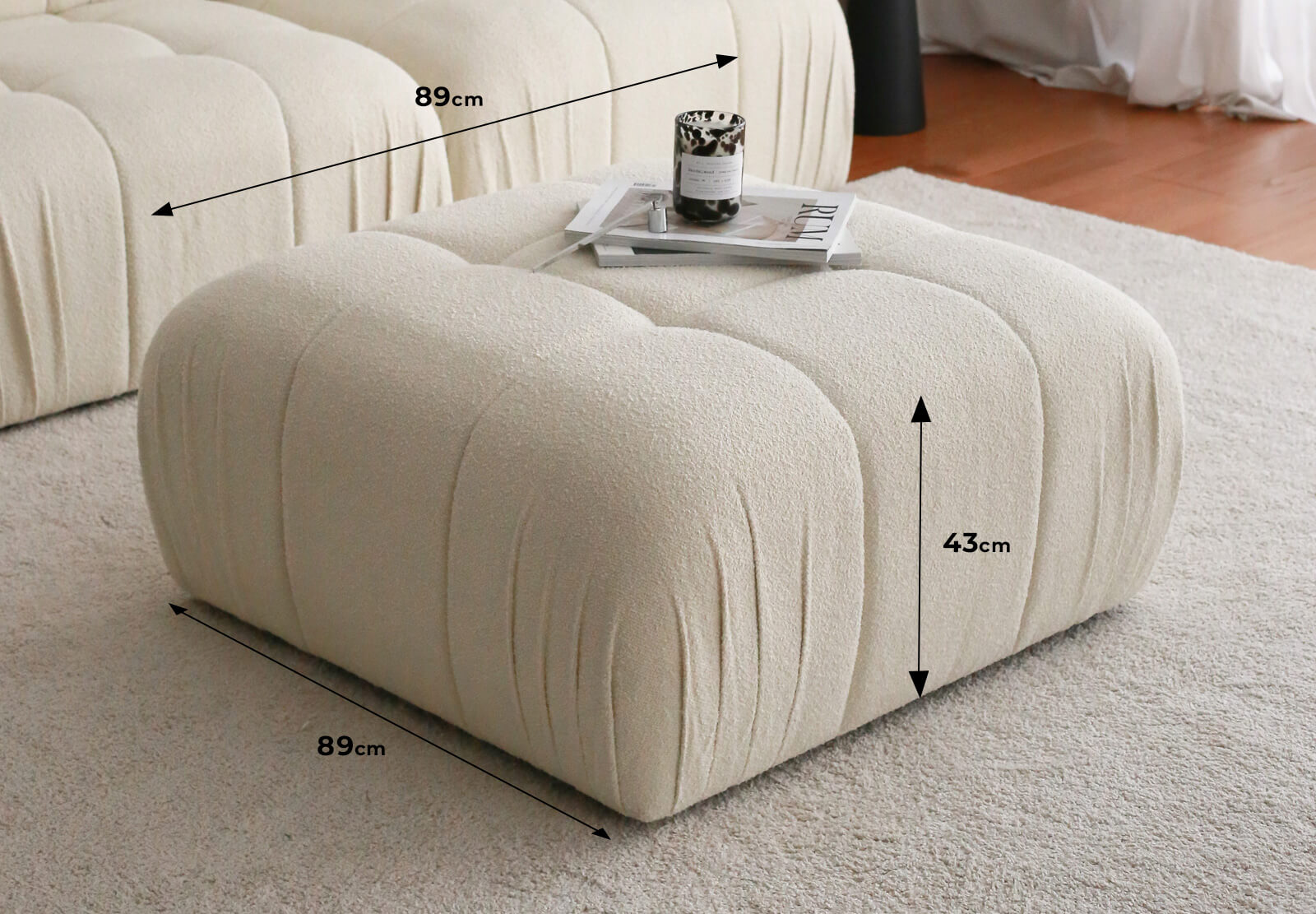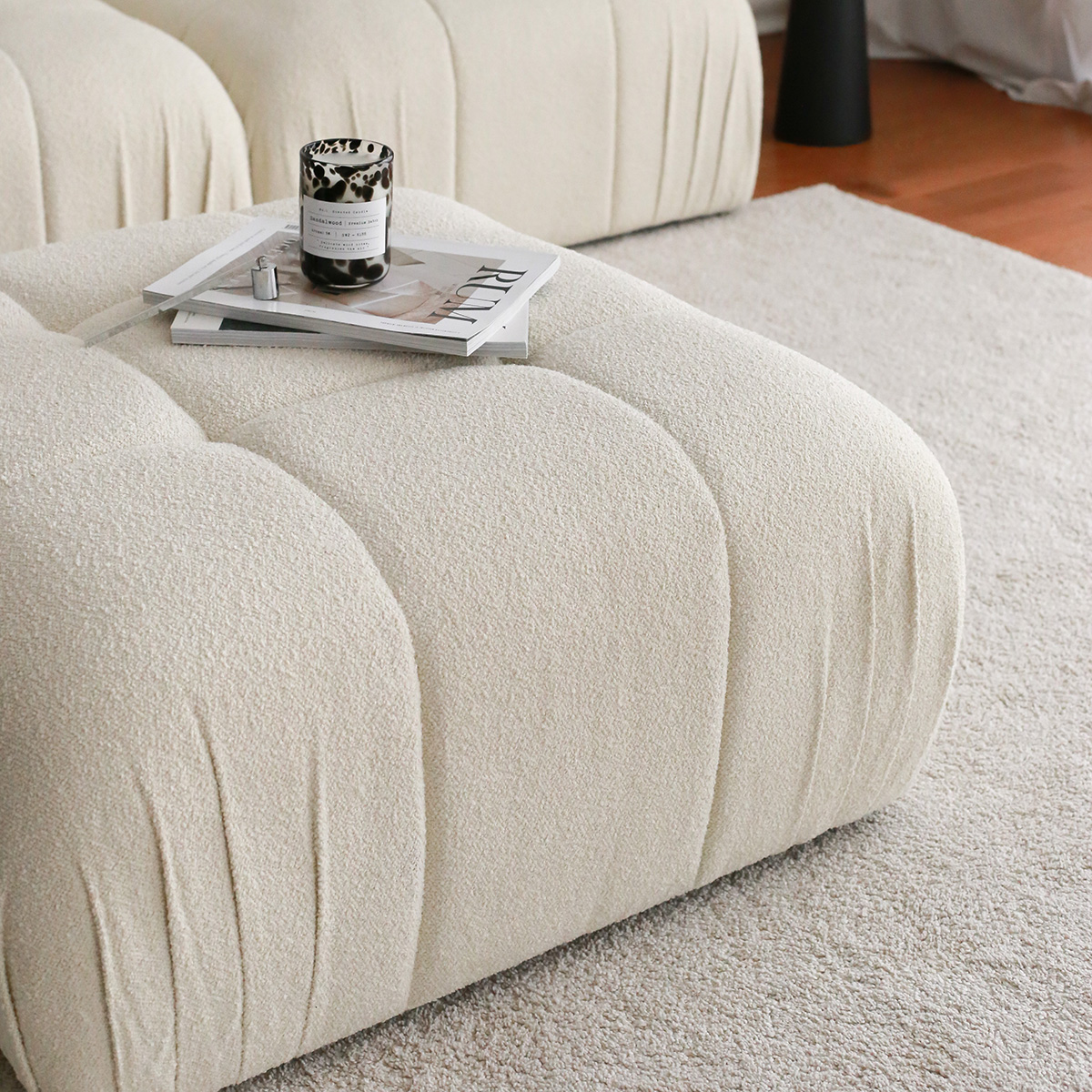 Solli, un de nos modèles les plus populaires avec son design moderne aux lignes douces, son tissu en bouclé naturel et ses détails bruts sont plus que modulaires.