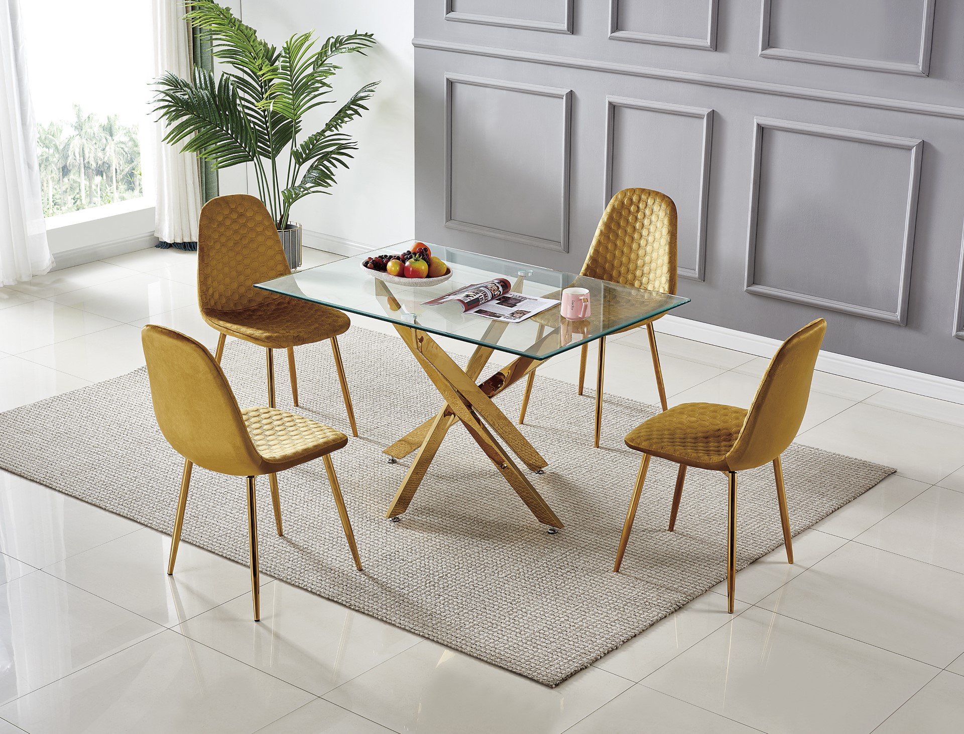 Table à manger pieds métal doré et plateau verre transparent.